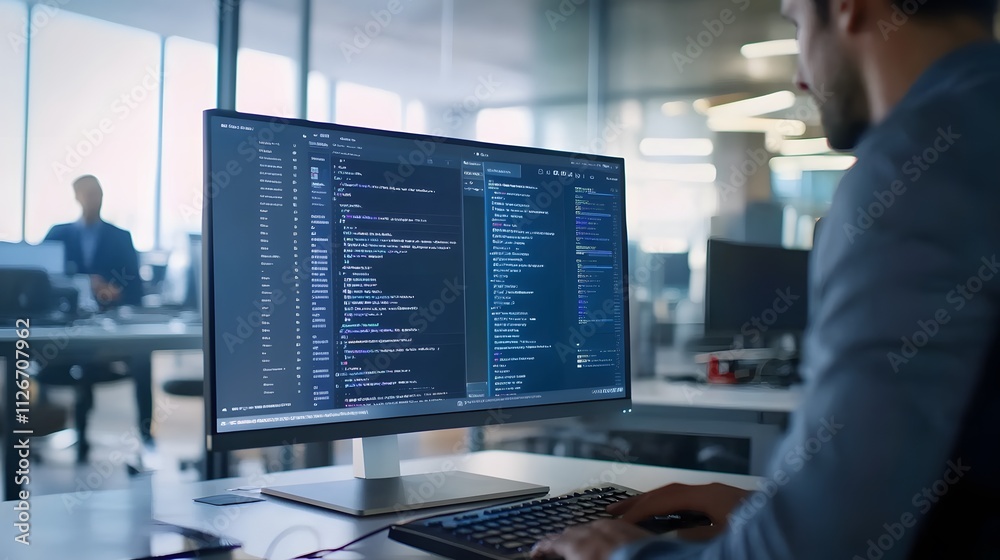 The watermark will not be included on Wall mural.: Programmer working on computer code in office setting
