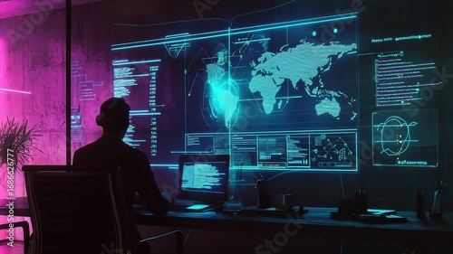 The watermark will not be included on Wall mural.: Programmer working on futuristic computer in high tech office analyzing global data