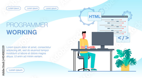 Wall mural programmer working. the programmer works on the computer. a man sits at his desk, above him windows  - Wall murals Wall mural programmer working. the programmer works on the computer. a man sits at his desk, above him windows - Wall murals