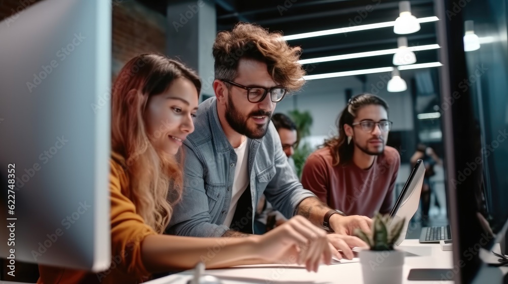 The watermark will not be included on Wall mural.: Programmers cooperating at it company developing apps, meeting and brainstorming and programming web
