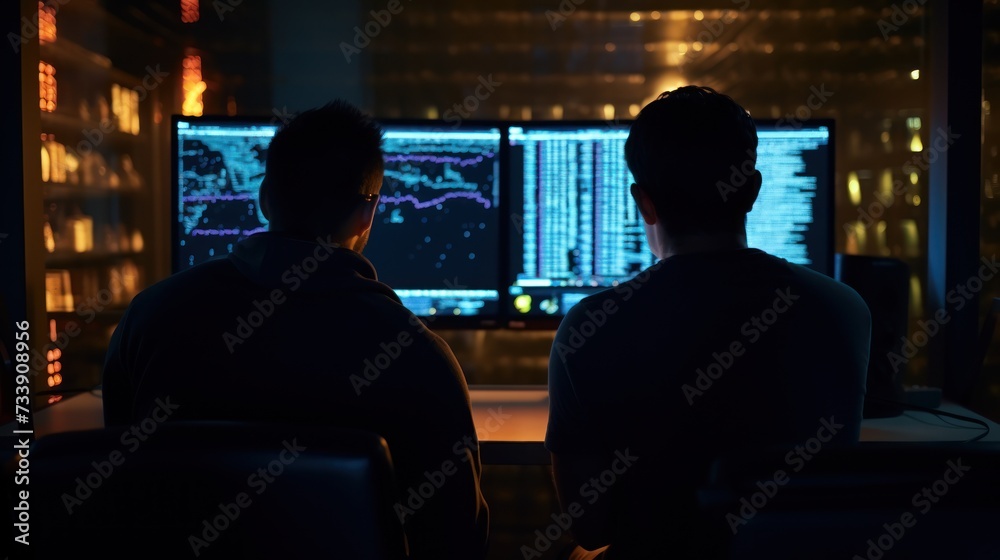 Wall mural programmers sit in front of the computer and write the source code and make changes to it - Wall murals Wall mural programmers sit in front of the computer and write the source code and make changes to it - Wall murals
