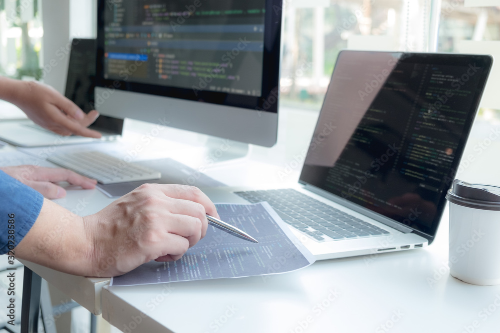 Wall mural : Programmers work on the development of coding and coding technology on white desks and website desig