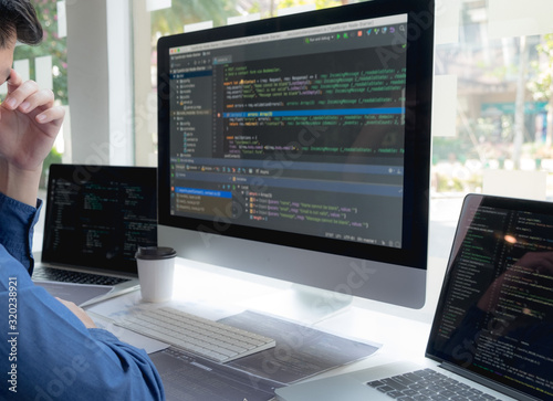 Wall mural : Programmers work on the development of coding and coding technology on white desks and website desig