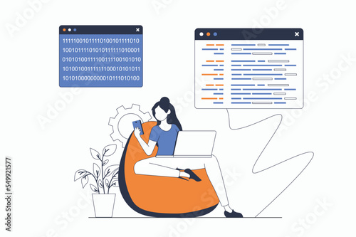 The watermark will not be included on Wall mural.: Programmers working concept with people scene in flat outline design - woman working with code on dif