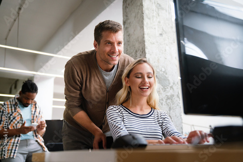 The watermark will not be included on Wall mural.: Programmers working in a software developing company office