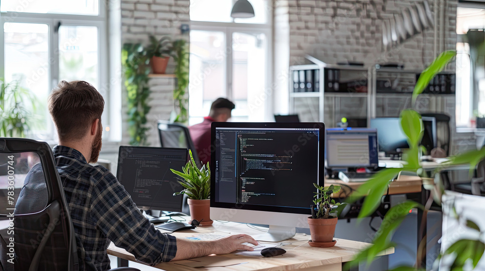 The watermark will not be included on Wall mural.: Programmers working on software in office