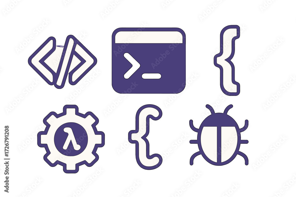 Wall mural programming and software development icons set with code, terminal, braces, lambda, and bug symbols - Wall murals Wall mural programming and software development icons set with code, terminal, braces, lambda, and bug symbols - Wall murals