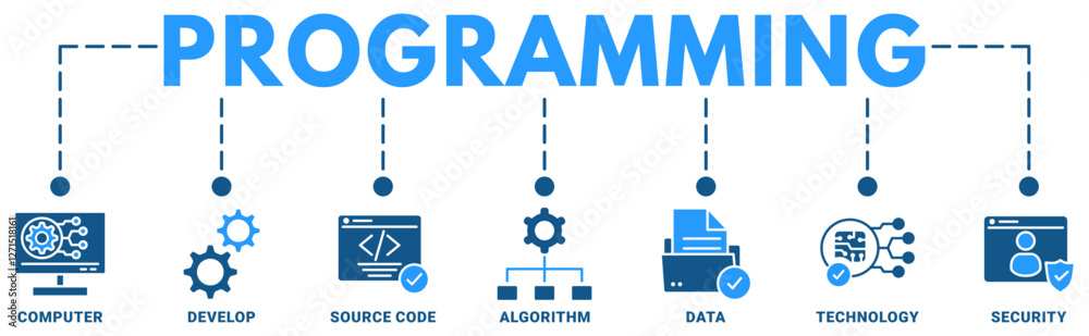 Wall mural programming banner web icon vector illustration concept with icon of computer, develop, source code, - Wall murals Wall mural programming banner web icon vector illustration concept with icon of computer, develop, source code, - Wall murals