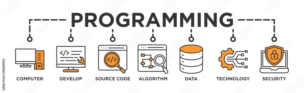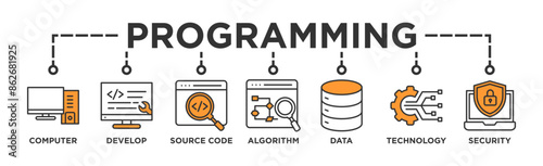 Wall mural programming banner web icon vector illustration concept with icon of computer, develop, source code,