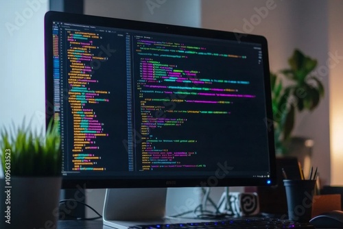 The watermark will not be included on Wall mural.: Programming code displayed on computer monitor in office setting