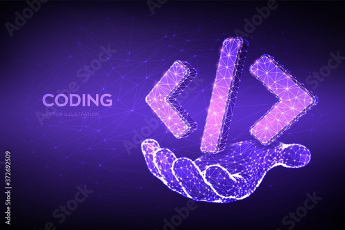 Wall mural : Programming code icon - 3d low polygonal abstract programming code symbol in hand - coding or hacker b