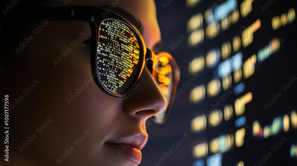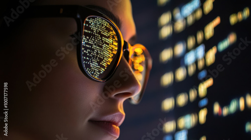 Wall mural programming code is reflected in the glasses of a woman working at a computer and creating programs