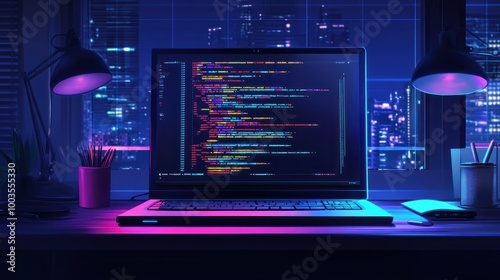Wall mural : Programming code on computer laptop screen, modern icon flat graphic illustration, developer person