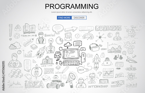 Wall mural : Programming concept with business doodle design style: online resources, coding skills, elearning ti