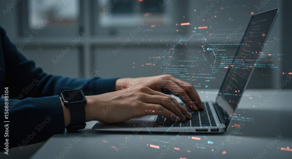 Programming concept: adult using laptop with digital code overlay, depicting software development anWall mural