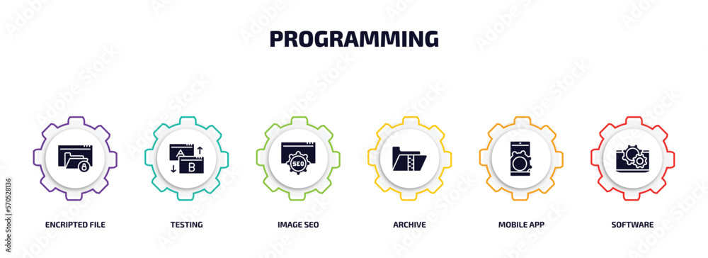 Wall mural programming infographic element with filled icons and 6 step or option. programming icons such as en