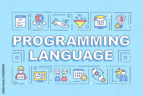 Wall mural programming language word concepts blue banner. computer commands. infographics with icons on color