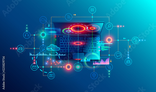The watermark will not be included on Wall mural.: Programming or software development abstract concept - top view at screen laptop with business icons,