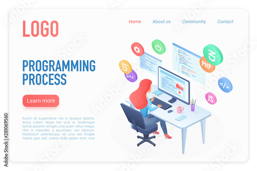 Wall mural programming process landing page isometric vector template. software development 3d concept. female
