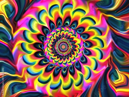 The watermark will not be included on Wall mural.: Psychedelic swirling mandala artwork with vibrant neon colors kaleidoscopic patterns creating mesmer