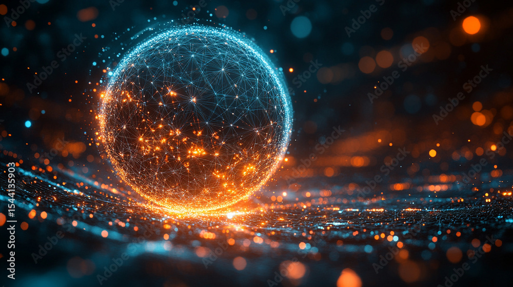 Wall mural : Pulsating wireframe sphere with coded lights glows against a dark background - abstract digital netwo