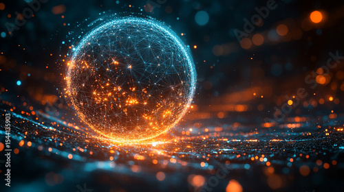 Wall mural pulsating wireframe sphere with coded lights glows against a dark background. abstract digital netwo