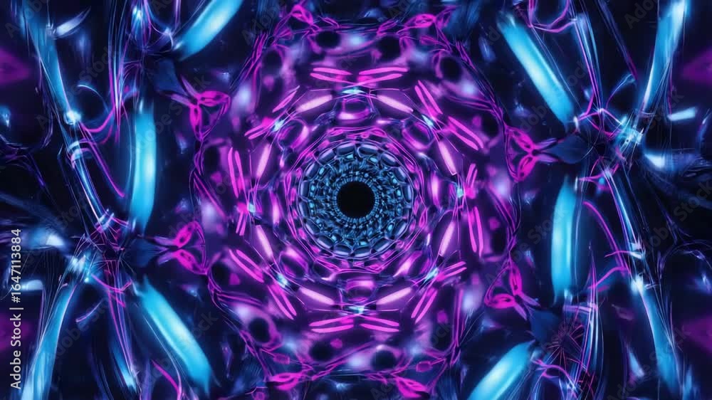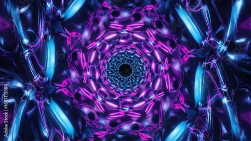 Wall mural purple and blue lights are glowing and creating a futuristic kaleidoscope pattern that forms a mesme