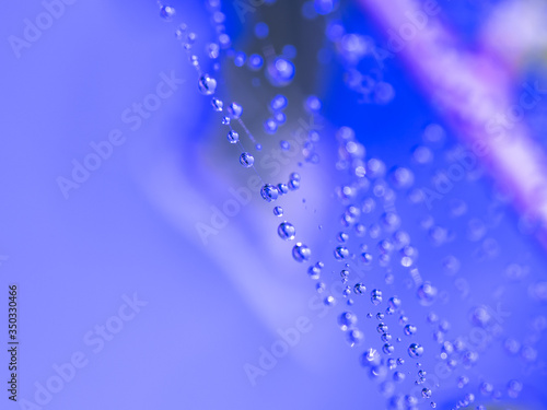 Wall mural purple background with small water drops on cobweb. macro view of dew on spider web with unnatural p