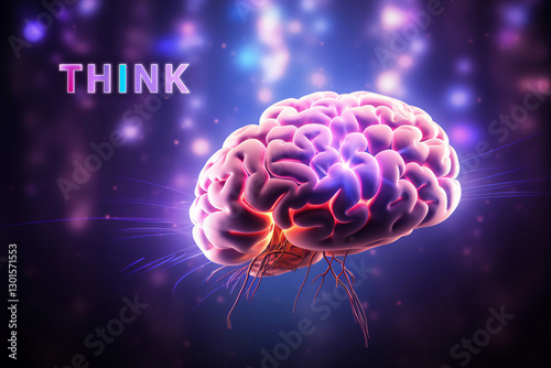 The watermark will not be included on Wall mural.: Purple neon human brain showing intelligent thinking, processing through the concept of a neural net