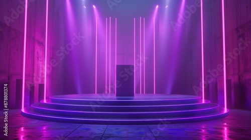 The watermark will not be included on Wall mural.: Purple neon lights illuminate a circular platform with a block in an empty room