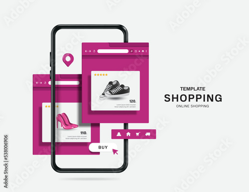 Wall mural : Purple tone online shopping app template on web browsers overlapping 2 tabs and all displayed on sma