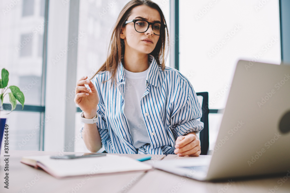 Wall mural puzzled female trainee in optical eyewear for vision correction watching tutorial webinar during net