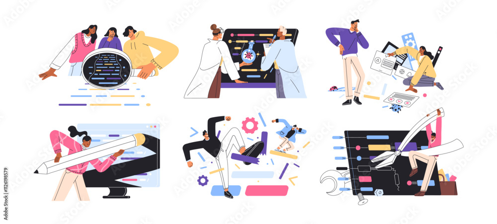 Wall mural quality assurance concept set. qa engineers, testers check errors, mistakes, testing computer softwa - Wall murals Wall mural quality assurance concept set. qa engineers, testers check errors, mistakes, testing computer softwa - Wall murals