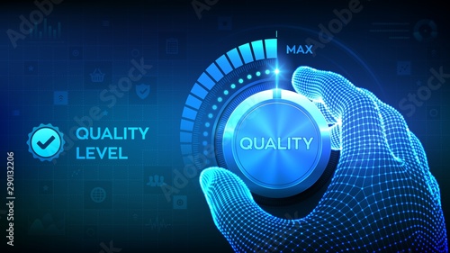 Wall mural : Quality levels knob button - wireframe hand turning a quality level knob to the maximum position - qua