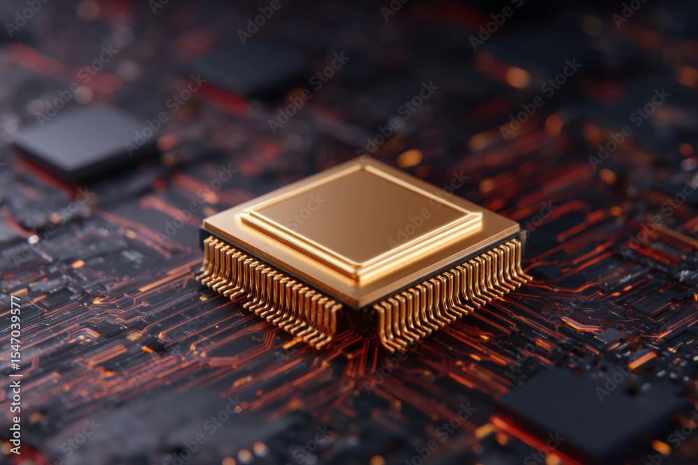 The watermark will not be included on Wall mural.: Quantum programming technology shines in futuristic microchip with gold pins on dark circuit board,