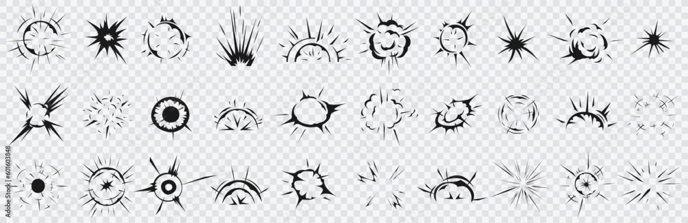 Wall mural : Radial explosion silhouette - exploding bursts, round explosions cloud and exploded bomb effect black