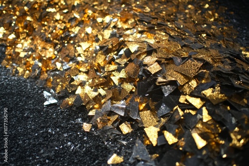Wall mural : Radiant golden glitter and shimmering particles floating in beams of warm light, creating a sparklin