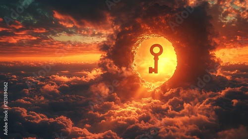 The watermark will not be included on Wall mural.: Radiant golden key floating near a giant keyhole embedded in the glowing sky symbolizing new paths b