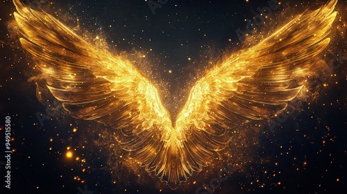 Wall mural radiant golden wings glowing with intense light and surrounded by sparkling particles, creating a di