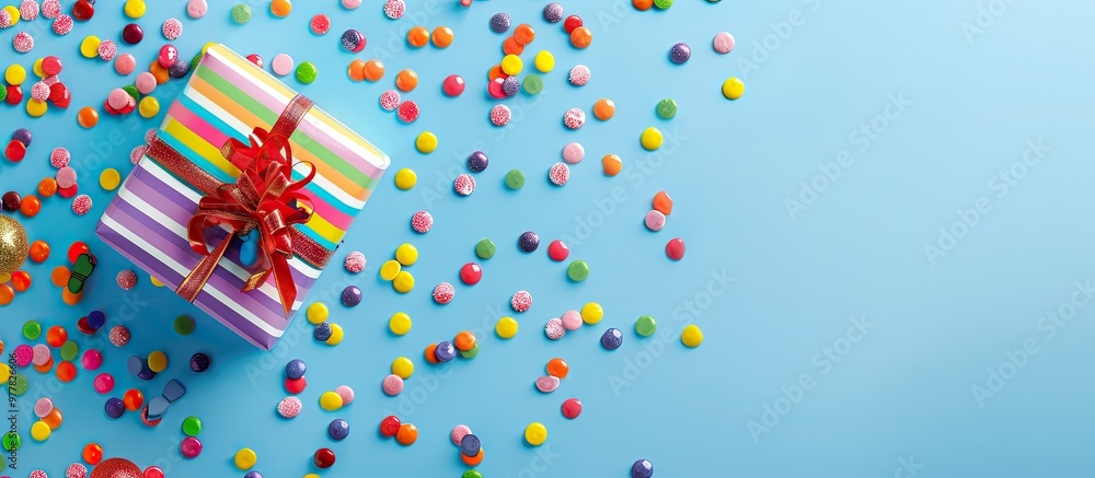 The watermark will not be included on Wall mural.: Rainbow gift box and candy confetti on a blue backdrop flat lay top view - copy space image - place fo