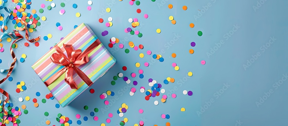 The watermark will not be included on Wall mural.: Rainbow gift box and candy confetti on a blue backdrop flat lay top view - copy space image - place fo