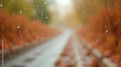 The watermark will not be included on Wall mural.: Raindrops gently fall over a blurred scene of a railroad surrounded by autumn foliage - the warm colo