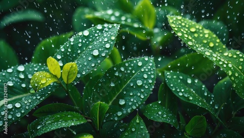 Wall mural : Raindrops on lush green leaves with a natural background providing empty space for text or captions -