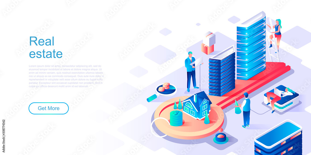 Wall mural real estate landing page vector template. private property website header ui layout with isometric i - Wall murals Wall mural real estate landing page vector template. private property website header ui layout with isometric i - Wall murals