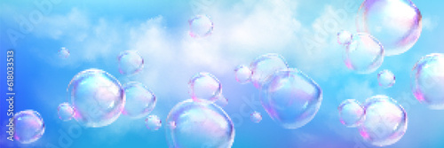 Wall mural realistic cloud background with iridescent glass foam. 3d dream spectrum soap bubble sphere blowing