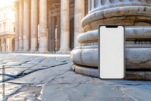 The watermark will not be included on Wall mural.: Realistic pov capture showing a hand holding a mobile phone with a blank white screen open to a mess