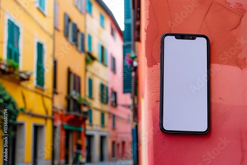 The watermark will not be included on Wall mural.: Realistic pov capture showing a hand holding a mobile phone with a blank white screen open to a mess