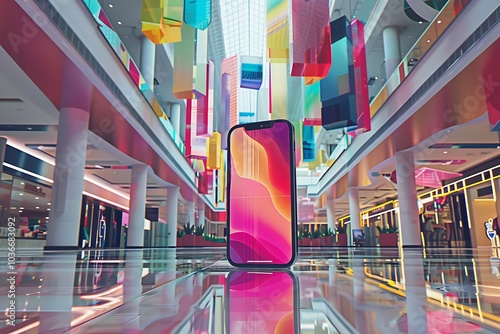 The watermark will not be included on Wall mural.: Realistic pov capture showing a hand holding a mobile phone with a blank white screen open to a mess