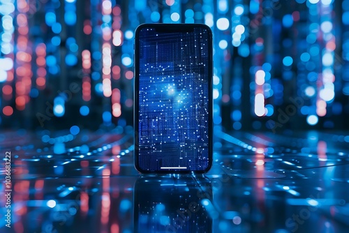 Wall mural : Realistic pov capture showing a hand holding a mobile phone with a blank white screen open to a mess