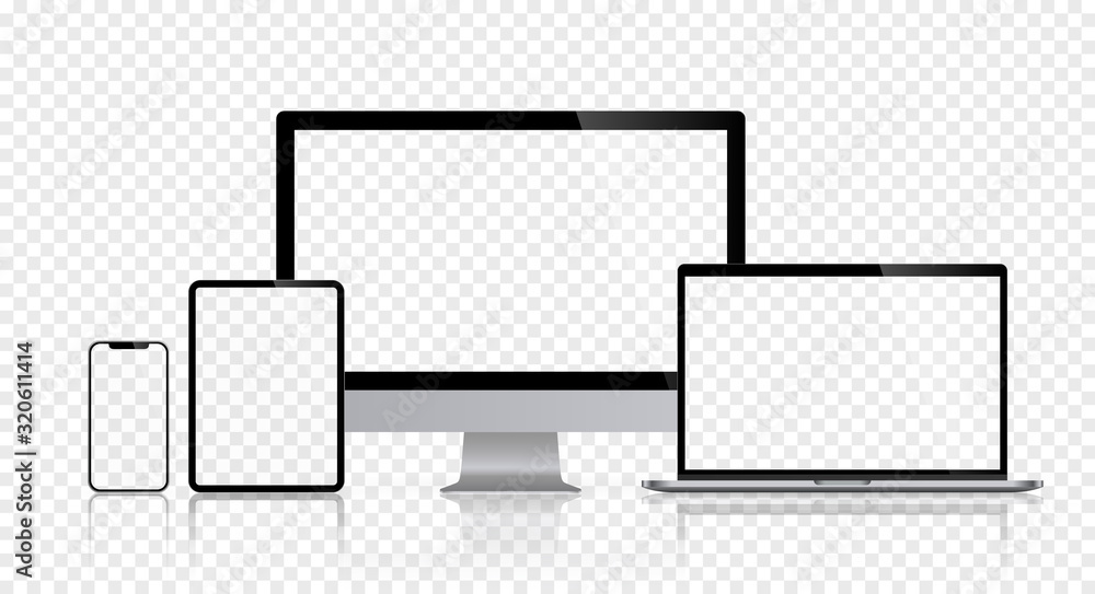 Wall mural : Realistic set of computer monitors desktop laptop tablet and phone reflect with checkerboard screen